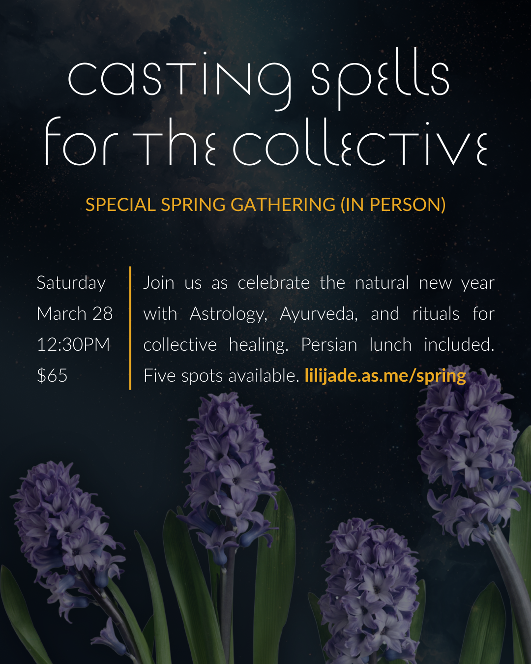 Over a light Persian lunch, Jaz Rambeau (Astrologer) will guide us through the astrological new year, highlighting key themes for the season and opportunities to work with the transits.